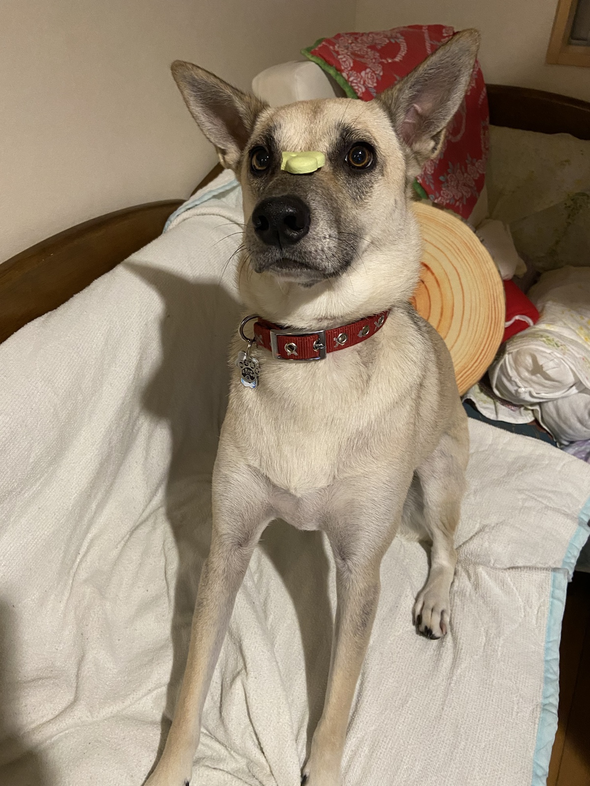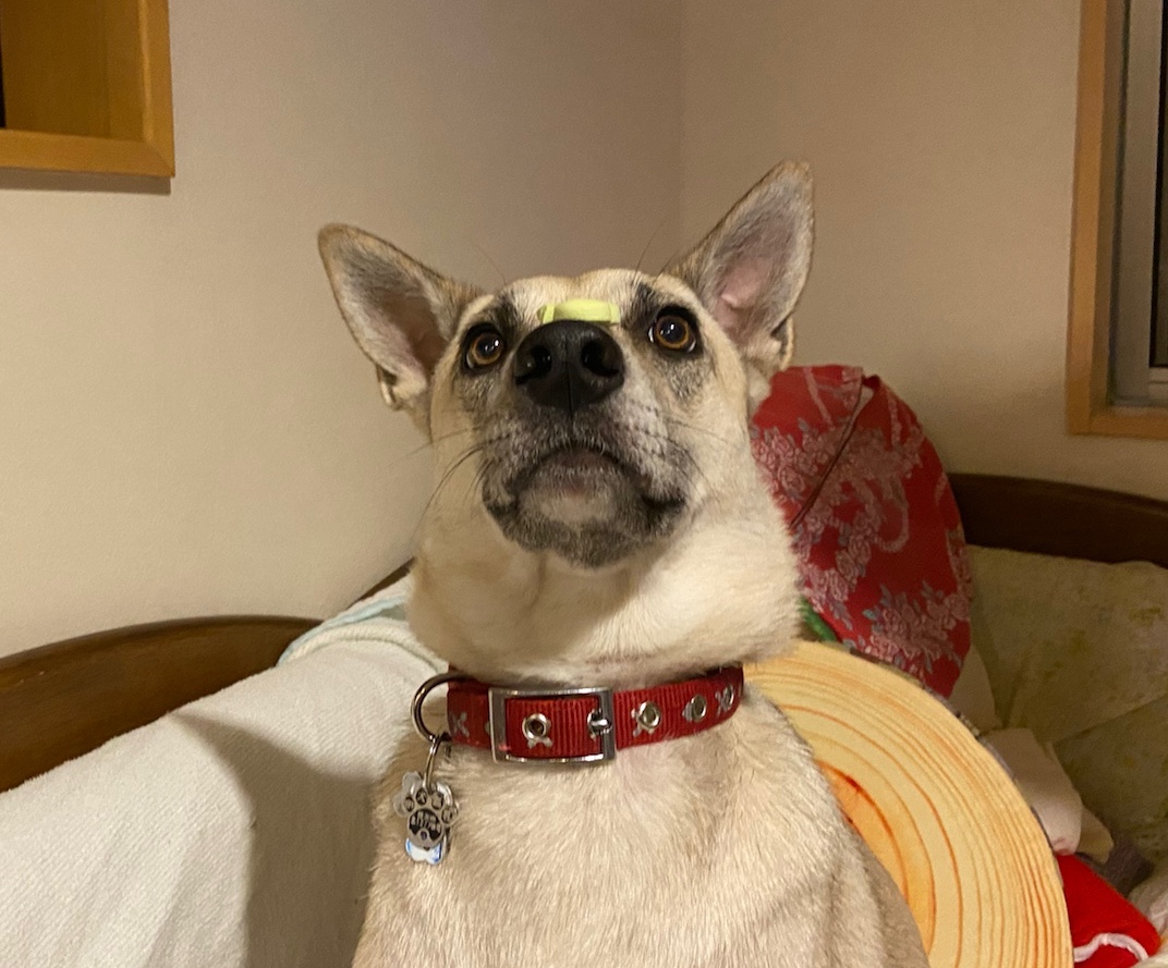 鼻の頭に乗ったビスケットを『よし!』というまでがまんできます!!